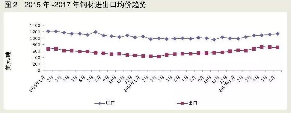 6月份,我国钢材进口均价为1142.21美元/吨,环比上涨24.25美元/吨,提高2.17%;1月~6月份,我国钢材进口均价为1078.18美元/吨,同比上涨83.11美元/吨,提高8.35%。6月份,我国钢材出口均价为709.34美元/吨,环比下跌13.40美元/吨,降低1.85%;1月~6月份,我国钢材出口均价为680.33美元/吨,同比上涨213.60美元/吨,提高45.77%。(见图2)