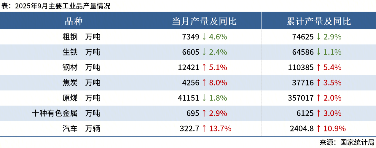 ◎据国家统计局,2025年9月,中国粗钢产量7349万吨,同比下降4.6%。其他主要工业品产量情况如下: