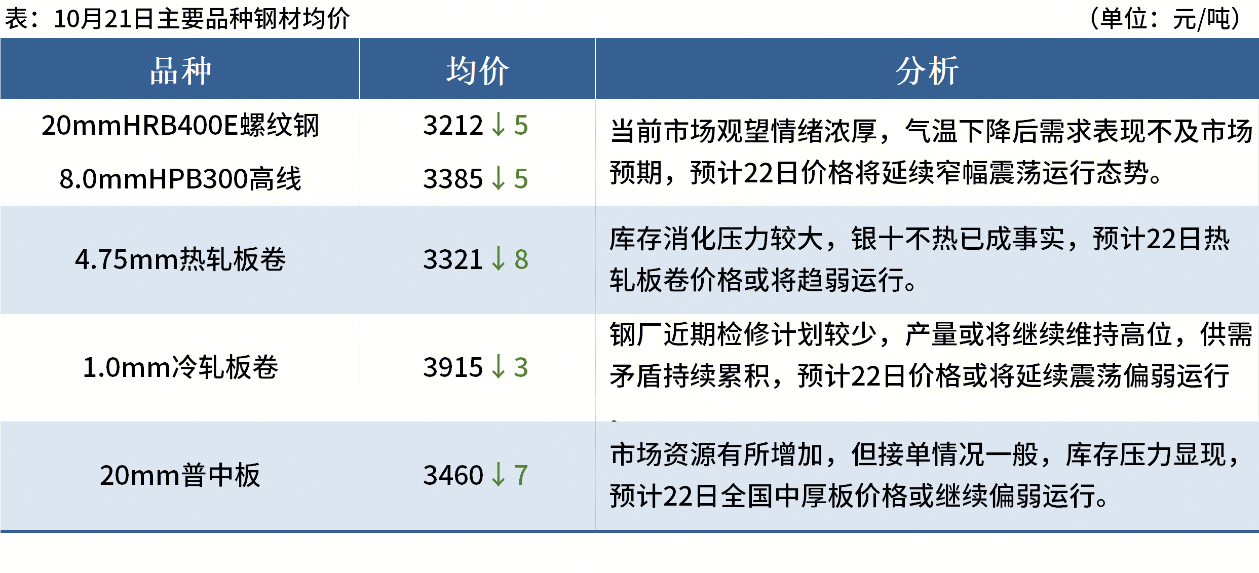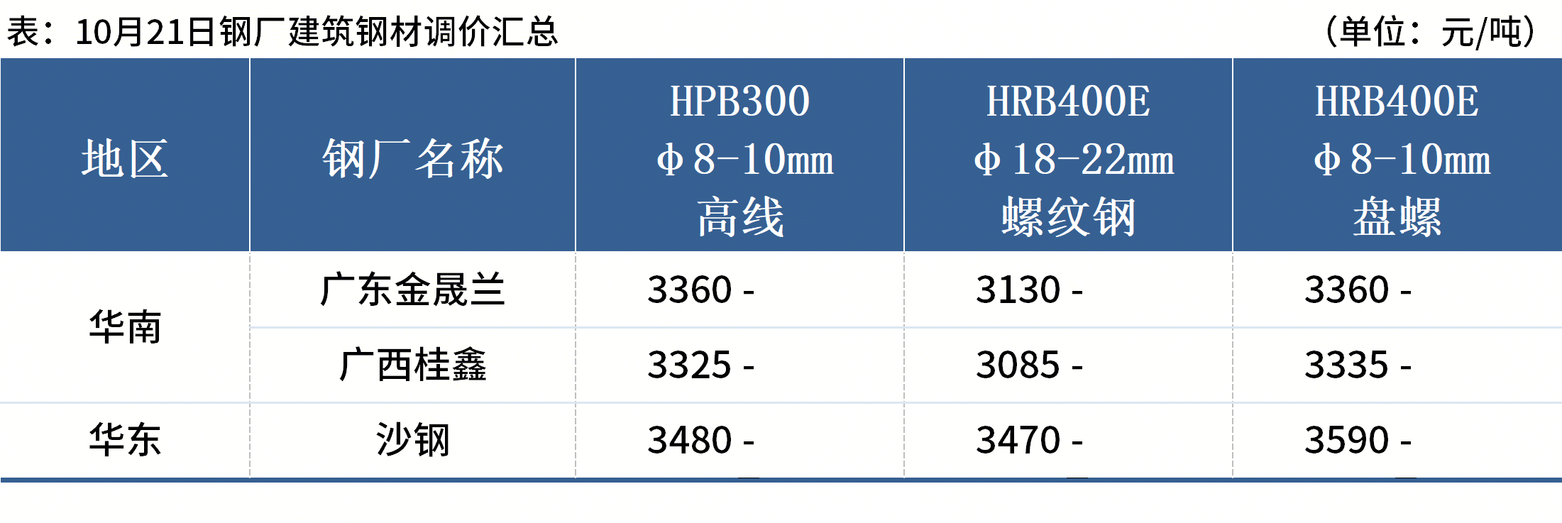 ◎10月21日,江苏永钢出台10月下旬出厂价,螺纹钢下调50元/吨、线材盘螺下调50元/吨,现螺纹钢3400元/吨,线材盘螺3600元/吨。