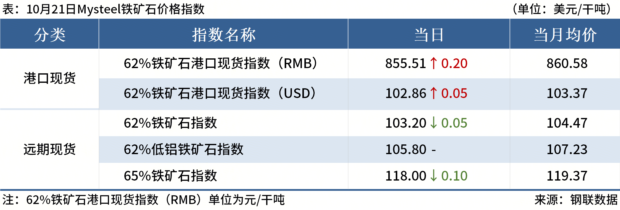 ◎10月21日,中国47港进口铁矿石港口库存总量15065.28万吨,较上周一增340.14万吨;45港进口铁矿石港口库存总量14368.88万吨,环比增282.74万吨。