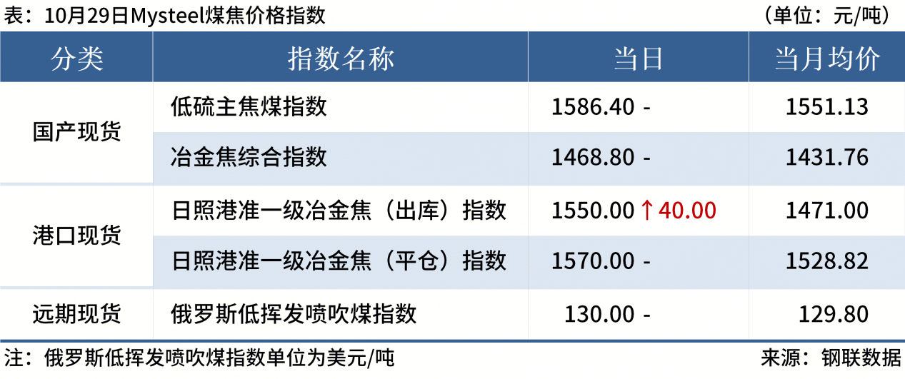 ◎ 10月29日,河北、山东等地部分焦企提涨焦炭第3轮,捣固幅度50-55元/吨,顶装幅度70-75元/吨,自10月31日0时起执行。