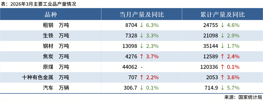 ◎国家统计局数据显示:2026年3月,中国粗钢产量8704万吨,同比下降6.3%;生铁产量7328万吨,同比下降3.3%。其他主要工业产品情况如下: