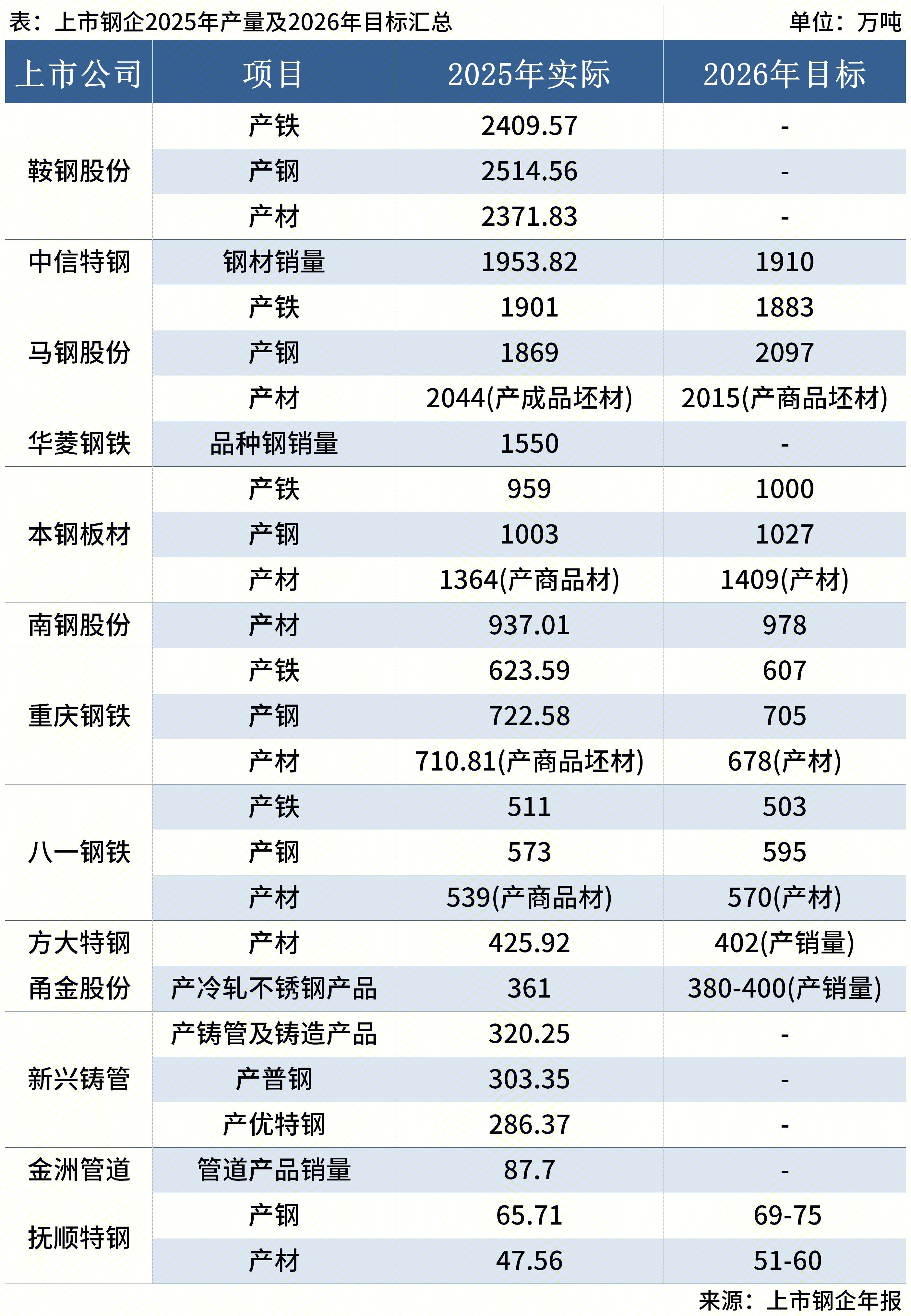 ◎近日国内上市钢企集中公布2025年年度报告。Mysteel对其中13家钢企提及2025年产量及2026年目标的内容进行了梳理,具体如下: