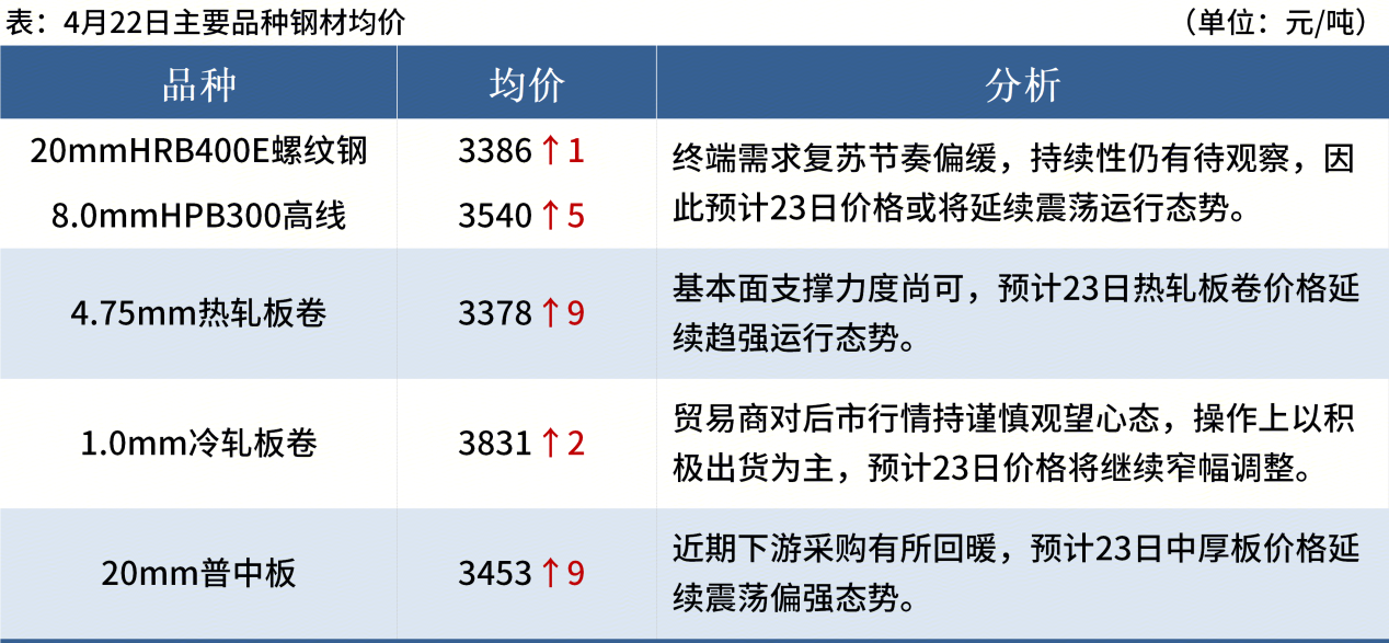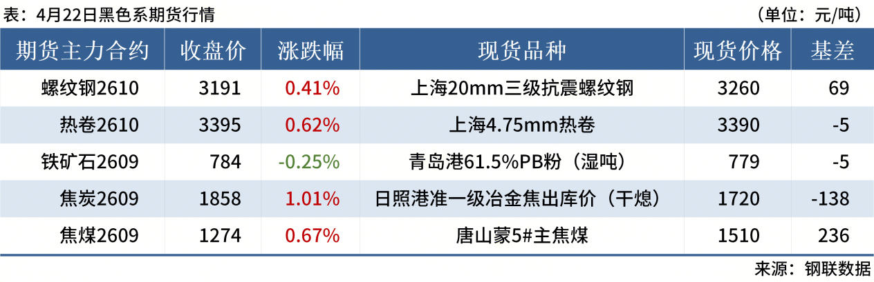 ◎ 4月22日,全国主港铁矿石成交57.00万吨,环比减19.5%;237家主流贸易商建筑钢材成交11.38万吨,环比减0.4%。