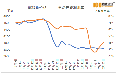 本周国内独立电炉钢厂复产数量继续缓慢回升,除了华东、西南地区较为集中外,河北、河南区域一些厂家也开始调试开炉。另外,由于近期建筑钢材市场表现平平,钢厂和社会库存明显升高,原计划于2月底复产的独立电炉钢厂继续保持观望态度,部分钢厂表示至少要到3月上旬才恢复生产。据鑫椤资讯统计,截止2019年2月22日,全国135家钢厂电炉钢产能利用率为45.8%,较上周增长7.04%。