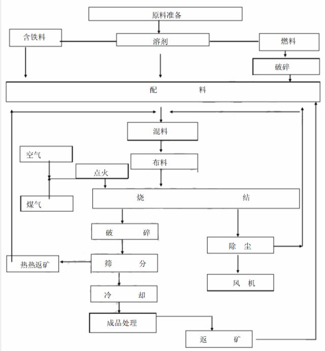 烧结生产工艺是为高炉冶炼提供“精料”,其实质是将准备好的各种原料(精矿、矿粉、燃料、熔剂、返矿及含铁生产废料等),按一定比例经过配料、混合与制粒,得到符合要求的烧结料。