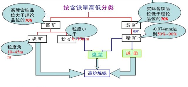 一、铁矿石介绍 铁矿石是钢铁生产企业的重要原材料,铁矿石经过破碎、磨碎、磁选、浮选、重选等程序逐渐选出铁。 1、自然界铁矿石的种类 在自然界中铁都是以化合物的状态存在,尤其是以氧化铁的状态存在的量特别多。 A、磁铁矿:是一种氧化铁的矿石,主要成份为Fe3O4,是Fe2O3和FeO的复合物,呈黑灰色,比重大约5.15左右,含Fe72.4%,O 27.6%,具有磁性。 B、赤铁矿:是一种氧化铁的矿石,主要成份为Fe2O3,呈暗红色,比重大约为5.26,含Fe70%,O 30%,是最主要的铁矿石。 C、褐铁矿:是含有氢氧化铁的矿石。它是针铁矿和鳞铁矿两种不同结构矿石的统称, D、菱铁矿:是含有碳酸亚铁的矿石,主要成份为FeCO3,呈现青灰色,比重在3.8左右。 2、铁矿石按含铁量高低分类 二、烧结的概念 将各种粉状合铁原料、配入适量的燃料和熔剂,加入适量的水、经混合和造球后在烧结设备上使物料发生一系列物理化学变化、将矿粉颗粒黏结成块的过程。 三、烧結生产工艺流程 目前生产上广泛采用带式抽风烧结机生产烧结矿,烧结生产的工艺流程如下图所示。主要包括烧结原料的准备、配料与混合、烧結和产品处理等工序。 1、烧结原料的准备 1)含铁原料 合铁量较高、粒度<5mm的矿料、铁精矿、高炉炉尘、轧钢皮、钢渣等。一般要求合铁原料品位高、成分稳定、杂质少。 2)熔剂 要求熔剂中有效Ca0含量高,杂质少、成分稳定,含水3%左右、粒度小于3mm的占90%以上。 3)燃料 主要为焦粉和无烟煤。对燃料的要求是周定C含最高、灰分低、挥发分低、含硫低、成分稳定、含水小于10%,粒度小于3mm的占95%以上。 2、配料与混合 1)配料目的:获得化学成分和物理性质稳定的烧结矿,满足高炉冶炼的要求。 常用的配料方法:容积配科法和质最配料法。 2)混合 A、混合目的:使烧结料的成分均匀,水分合适,易于造球,从而获得粒度组成良好的烧结混合料,以保证烧结的质量和提高产量。 B、混合作业:加水润湿、泥匀和造球。 根据原料性质不同,可采用一次混合和二次混合两种流程。 一次混合的目的: 润湿与混匀,当加热返矿时还可使物料预热。 二次混合的目的:继续混匀、造球,以改善烧结料层透气性。 3、烧结生产 1)布料:将铺底料、混合料铺在烧结机台年上的作业。 A、当采用铺底料工艺时,在布混合料之前,先铺一层粒度度为10-25mm,厚度为20-25mm的小块烧结矿作为铺底料,其目的是保护炉箅,降低除尘负荷,延长风机转子寿命,减少或消除炉箅粘料。 B、铺完底料后,随之进行布料。布料时要求混合料的粒度和化学成分等沿台车纵横方向均勾分布,并且有一定的松散性,表面平整。  2)点火:点火操作是对台车上的料层表面进行点燃,并使之燃烧。   点火要求有足够的点火温度,适宜的高温保持时间,沿台年宽度点火均匀。 3)烧结 准确控制烧结的风量、真空度、料层厚度、机速和烧结终点。 A、烧结风量:平均每吨烧结矿需要风量3200m3,按烧结面积计算为(70~90)m3/(cm2. min). B、真空度:决定于风机能力、抽风系统阻力、料层透气性和漏风损失情况。 C、料层厚度:合适的科层厚度应将高产和优质结合起来考虑。机速:合适的机速应保证烧结料在预定的烧结终点烧透烧好。 D、烧结终点的判断与控制:控制烧结终点,即控制烧结过程全部完成时合车所处的位置。中小型烧结机终点一般控制在倒效第一个风箱处、大型烧结机控制在倒数第三个风箱处。 烧结阶段: 低温预烧阶段:在此阶段主要发生金属的灰分及吸附气体和水分的挥发,压坯内成形剂的分解和排除等。 中温升温烧结阶段:此阶段开始出现再结晶,在颗粒内,变形的晶粒得以恢复,改组为新晶粒,同时表面的氧化物被还原,颗粒界面形成烧结。 高温保温完成烧结阶段:此阶段中的扩散和流动充分的进行和接近完成,形成大量闭孔,并继续缩小,使孔隙尺寸和孔隙总数有所减少,烧结体密度明显增加。 4)成品处理 当台车行走到烧结机尾部时,烧结过程结束。红热的烧结块滑落到单辊破碎机上被剪切破碎。 破碎后的烧结矿经热振动筛,筛除小于5mm的粉末后送冷却剂冷却,并进行整粒,如下图为烧结矿成品。