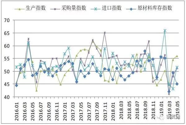 5月份,环保限产力度较小,部分钢企通过并购重组提升了行业集中度,带动了产量上升。生产指数为56.0%,较上月上升1.5个百分点。与此相应,企业原材料采购也有所增加,原材料采购量指数为51.2%,较上月上升3.2个百分点,进口指数为51.6%,较上月上升8.4个百分点。由于生产扩张,原材料加快消耗,原材料库存指数为45.1%,较上月下降4.4个百分点。