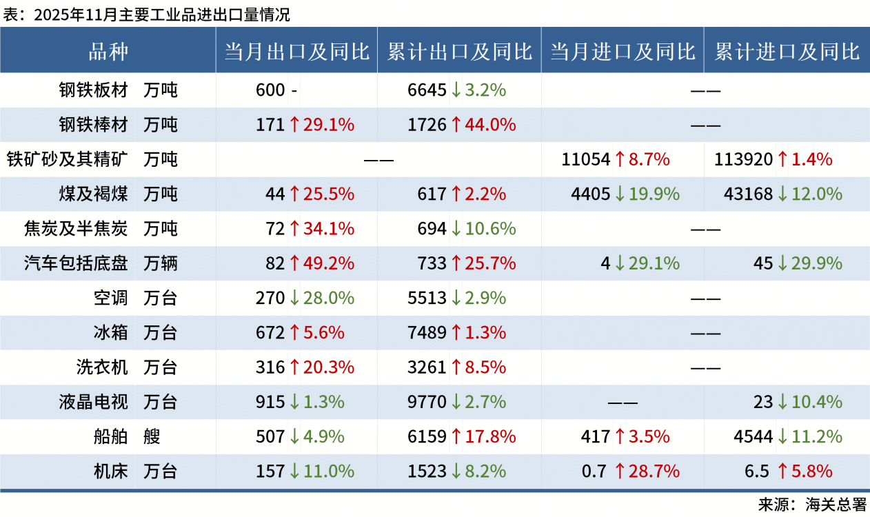 ◎海关总署数据显示,2025年11月,中国出口钢铁板材600万吨,同比持平;1-11月累计出口6645万吨,同比下降3.2%。其他主要工业品进出口情况如下: