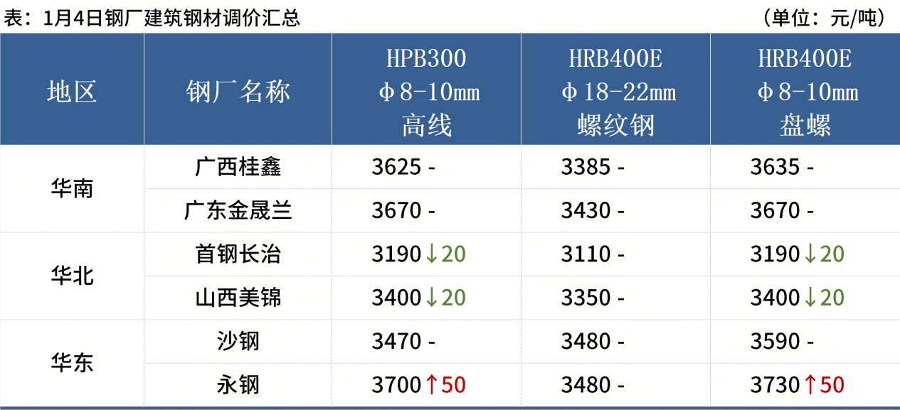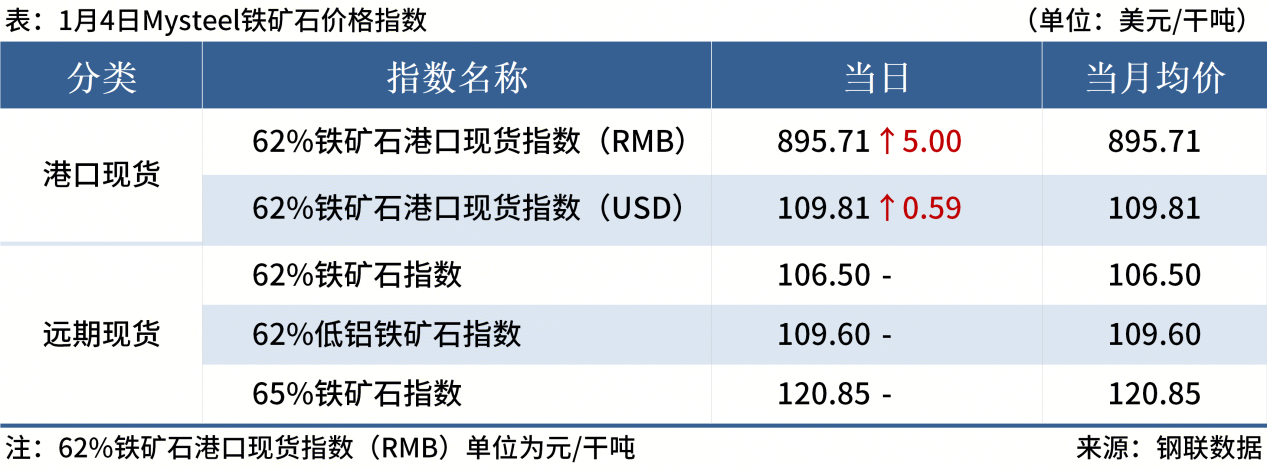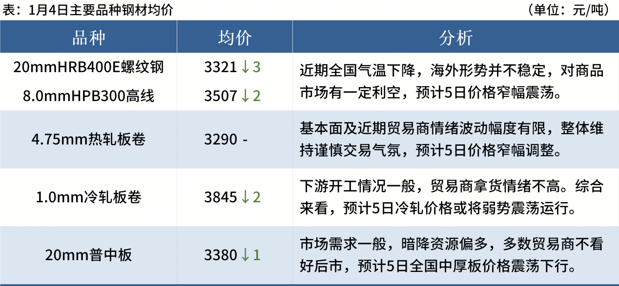 ◎ 1月4日,全国主港铁矿石成交45.60万吨,环比减26.2%;237家主流贸易商建筑钢材成交9.10万吨,环比增9.9%。