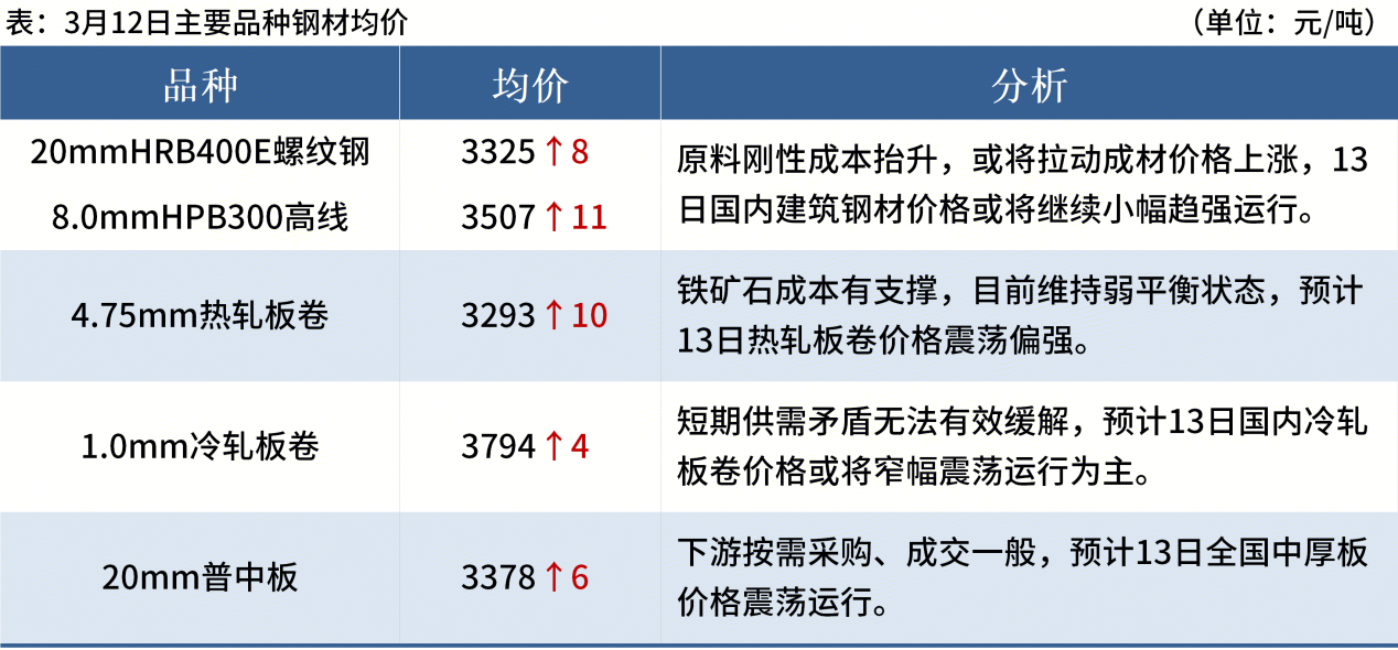 ◎ 3月12日,唐山迁安普方坯资源出厂含税上调20,报2970元/吨。
