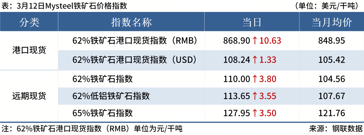 ◎ 3月12日,Mysteel进口铁矿石62%澳洲粉矿远期现货指数110美元/干吨,涨3.8美元/干吨,月均104.56美元/干吨。