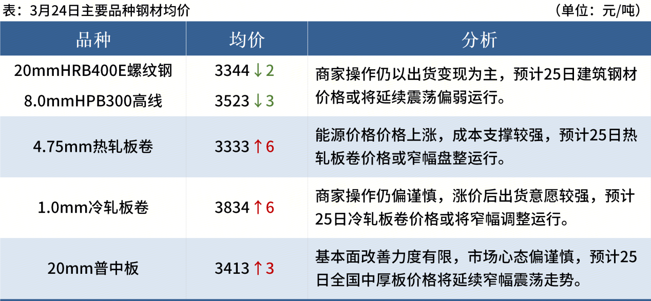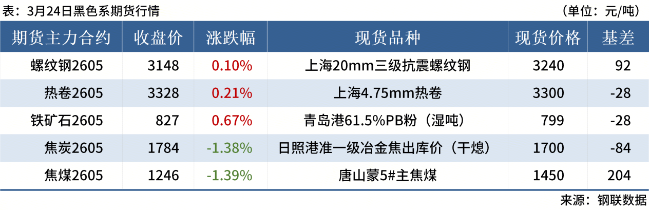 ◎ 3月24日,全国主港铁矿石成交75.50万吨,环比增8.3%;237家主流贸易商建筑钢材成交9.35万吨,环比减14.9%。