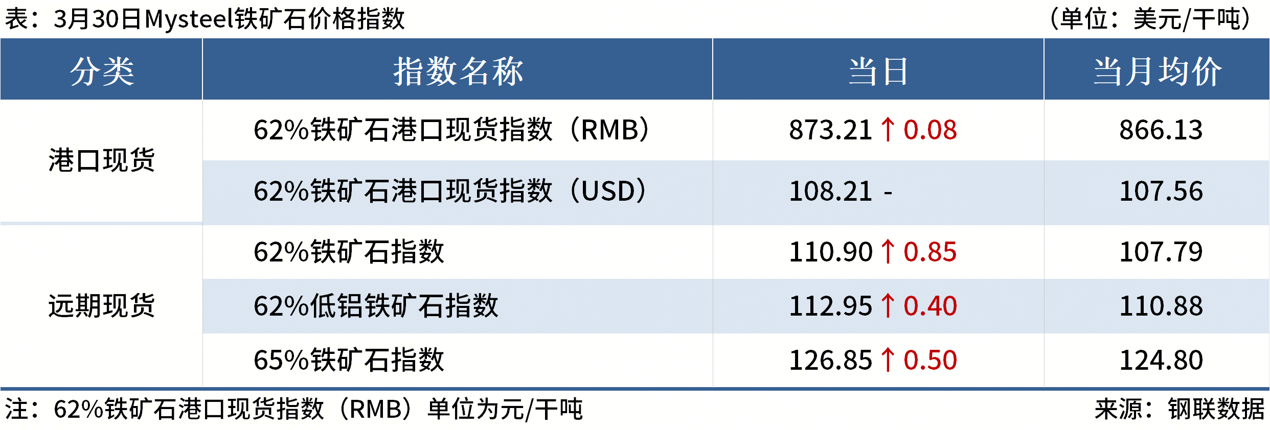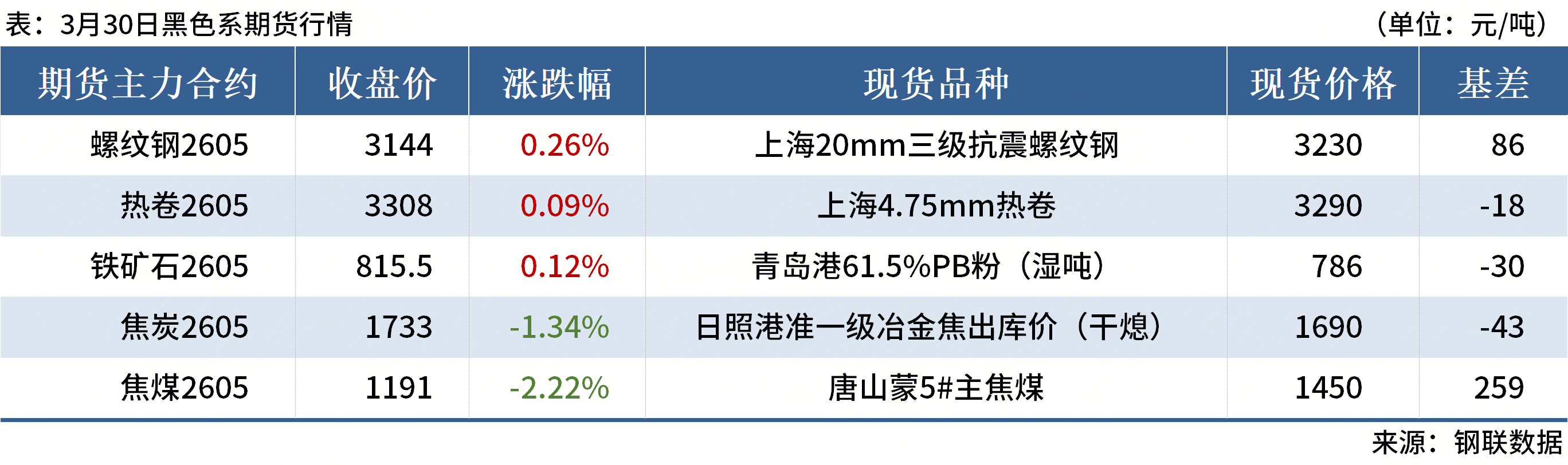 ◎3月30日,全国主港铁矿石成交59.10万吨,环比减11.1%;237家主流贸易商建筑钢材成交10.42万吨,环比增10.4%。