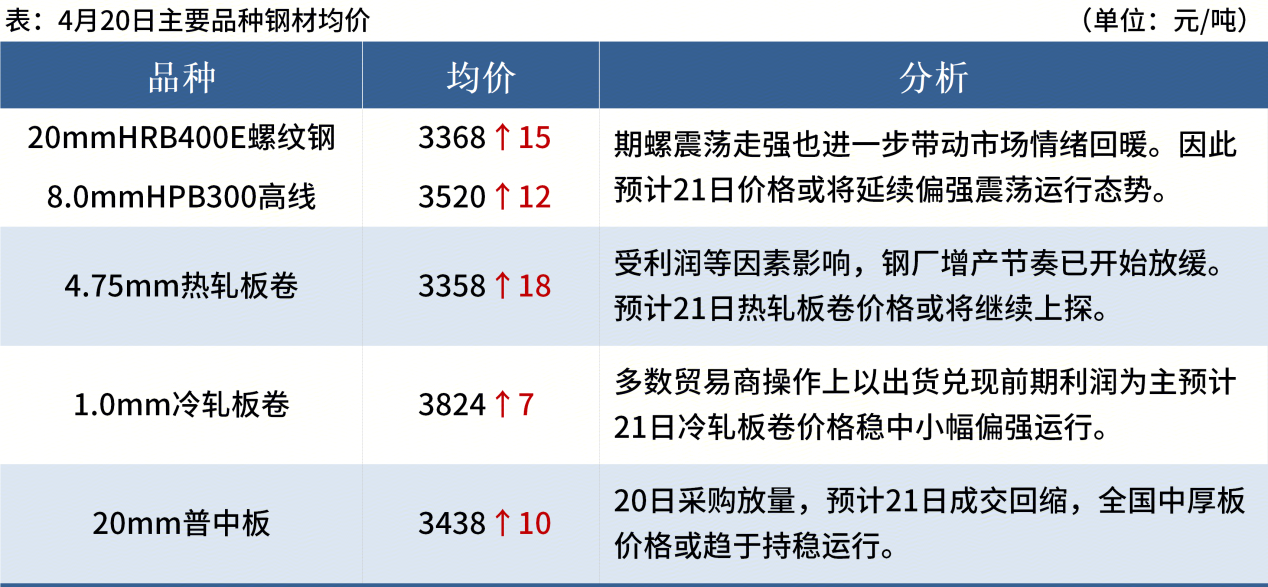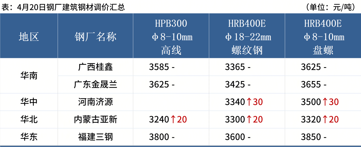◎ 4月20日,唐山迁安普方坯资源出厂含税上调20,报3000元/吨。