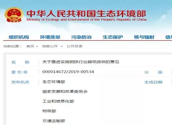 4月28日,生态环境部等五部委联合发布《关于推进实施钢铁行业超低排放的意见》。中国钢铁行业开启了超低排放绿色革命。首钢、太钢、安钢、宝钢股份、河钢唐钢、河钢邯钢、河钢石钢、德龙钢铁、中天钢铁等一批钢企克服重重困难,推进超低排放改造并率先取得突破。