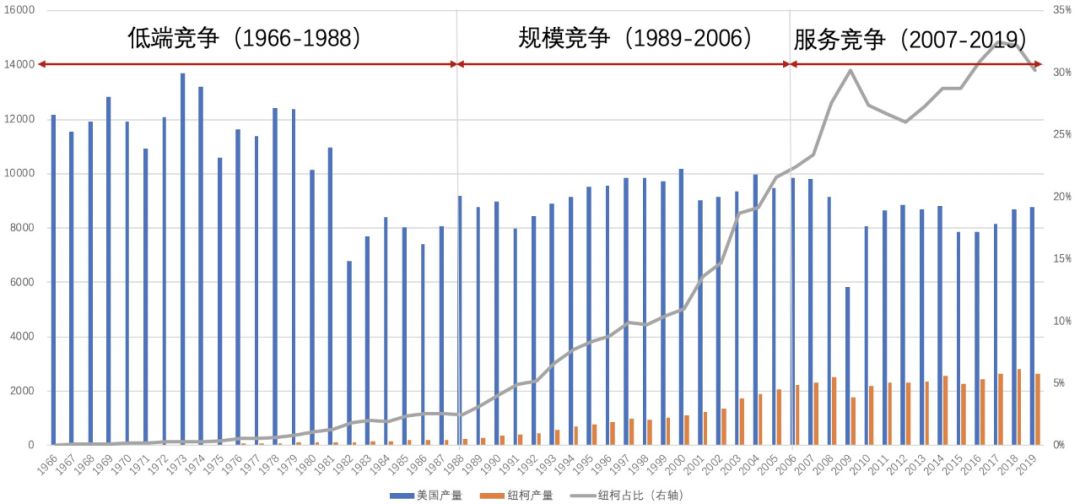 2019年,纽柯在全球钢铁企业排名位居第14位,前面13家有9家是中国钢铁企业。在世界钢动态2019年世界级钢铁企业竞争力排名中,中国钢铁企业最好的排名名次是第14位,得分7.32。纽柯以8.08分列居第2(排名第1的是浦项),而且是长期位居该榜单前列。吉姆·柯林斯在《基业长青》中指出:“公司从优秀到卓越,跟从事的行业是否在潮流之中没有关系。很多实现跨越的公司从事的并非是景气行业,有的甚至是处境很糟的行业”。纽柯自1966年开始销售钢材以来,54年平均吨钢净利润为43.5美元,最高纪录2006年的129美元,唯一的一年亏损是-28美元。纽柯持续保持盈利,与其不断调整结构、适应环境变化密不可分。
