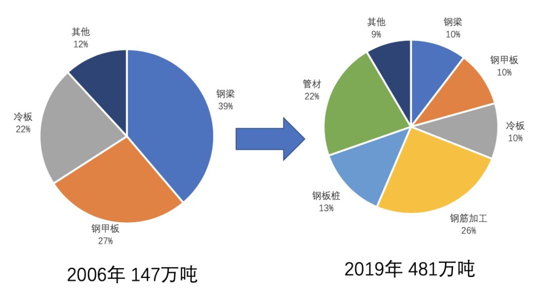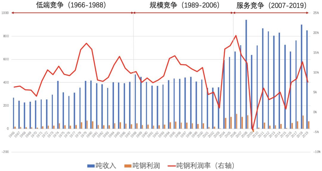 第一阶段(1966-1988),以小博大,以低成本求发展阶段在这个阶段,纽柯以钢梁加工为主业,先后投建5家钢梁加工厂,并进入冷板加工、紧固件、宽法兰梁、建筑钢结构等领域,年加工量达到90万吨。涉足炼钢初心是为了配套加工厂,后看到原品销售给企业带来的利润明显超过加工环节,才逐步加大外销比例。自1966至1988年,纽柯钢材总销量从7.8万吨增长到226万吨,钢材直接销售量从0.4万吨增长到144万吨,钢材直接外销比例从2%增长到64%。钢梁的吨钢净利润水平是15美元;其内部实现供应之后,吨钢净利润水平为27美元;在外销比例超过50%之后,吨钢净利润水平在47美元。其核心原因是纽柯采取电炉炼钢工艺,其低固定资产投入、以废钢为原料、较低的人工投入,相比长流程钢厂有20%的成本优势。当时,美国市场螺纹钢毛利率在7%左右,纽柯凭借这个优势,在钢铁业站稳了脚跟。第二阶段(1989-2006):自低向高,以规模求发展阶段1988年前后,短流程小钢厂在螺纹钢市场打败了长流程钢铁联合企业。但由于市场价格战,相应市场价格暴跌20%,市场利润大大缩水。纽柯在该阶段,选择在坚守低成本竞争力下的规模化扩张战略,扩大螺纹钢核心产品的市场份额,积极向高端市场渗透。1989年,全球第一条年产能力100万吨薄板坯连铸连轧带钢(CSP)生产线在纽柯出钢,两年后规模化生产,成功进入薄板市场。2000年前后,美国制造业一蹶不振,大批钢铁企业破产。纽柯开展25项收购活动,涉及金额45亿美元,产品涵盖薄板、棒材、型材、中厚板等四大品种,嬴利能力迅速提升。2006年,纽柯薄板销量850万吨、棒材651万吨、型材321万吨、中厚板243万吨,分别占比41%、32%、16%、11%,2004至2006年,吨钢净利润高达109美元。纽柯钢材销量从1988年的226万吨增长到2006年的2212万吨,整整增长10倍;营收从10.6亿美元增长到147亿美元,息税前利润从1.08亿美元增长到26.92亿美元。第三阶段:从硬到软,以服务求发展阶段(2007-2019)2008年,始自美国的全球金融危机,全球钢铁行业大面积亏损,美国钢材市场下降到8000万吨水平,在许多地区传统制造业工作岗位已经消失。纽柯开始向产业链一体化、向行业服务转型进行布局,产品由硬核的钢材原品向钢材深加工、钢材行业解决方案转型。在向上游延伸方面,2008年,纽柯完成对DJJ公司的收购。DJJ是美国历史最悠久、最综合化服务的金属废料回收公司,全球拥有60个废料回收基地和21个办事处,总资产20亿美元,纽柯也一举成为北美最大的废钢回收公司。在向行业服务转型方面,2007年,纽柯以10.7亿美元收购哈里斯钢铁集团,进入钢筋加工制造领域,一举成为北美最大的钢筋加工制造服务商;2012年,纽柯收购钢板桩生产商Skyline公司;2016年,纽柯收购一家制管企业,进入管材服务领域;2018年收购一家墨西哥精密铸造加工企业。同时加快对现有加工企业进行改造,纽柯加工材销售量从2006年147万吨快速增长到2019年481万吨,钢材原品销售则从2006年2065万吨下降至2019年1859万吨。2019年,纽柯钢梁销售量50万吨、钢甲板加工50万吨、冷板加工50万吨、钢筋加工120万吨、钢板桩64万吨,管材105万吨,其他还有40万吨。相较2006年,纽柯在终端服务行业领域的拓展,数量和品种实现大幅提升。