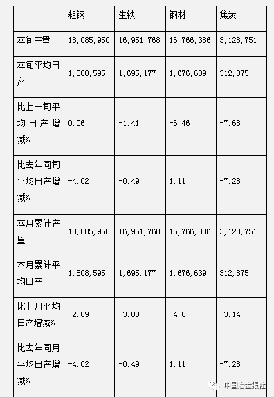本月重点统计钢铁企业累计平均日产,粗钢180.86万吨,环比增长2.89%、同比下降4.02%;生铁169.52万吨,环比下降3.08%、同比下降0.49%;钢材167.66万吨,环比下降4.0%、同比增长1.11%。