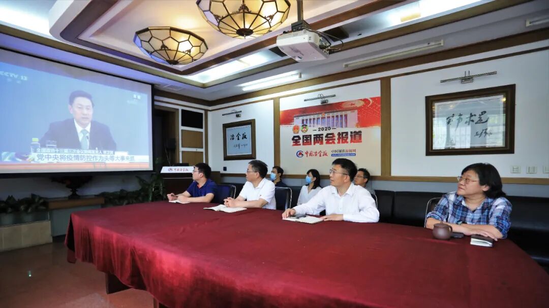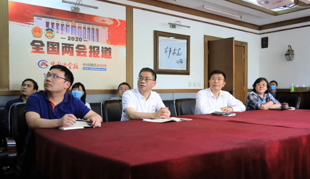 图为中国冶金报社领导和员工在收看全国政协十三届三次会议首场新闻发布会。