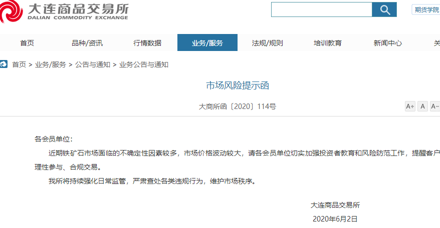 日前,大连商品交易所发布市场风险提示函,提示函表示,近期铁矿石市场面临的不确定性因素较多,市场价格波动较大,请各会员单位切实加强投资者教育和风险防范工作,提醒客户理性参与、合规交易。大商所表示,将持续强化日常监管,严肃查处各类违规行为,维护市场秩序。