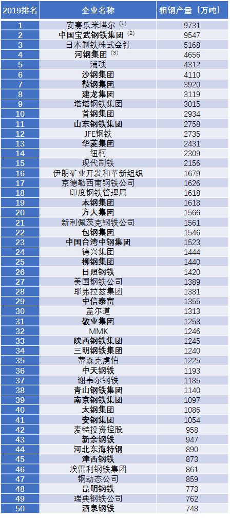 近日,世界钢铁协会发布《世界钢铁统计数据2020》,根据这份统计数据,世界钢协发布了全球前50大钢铁企业榜单(如下表所示)。