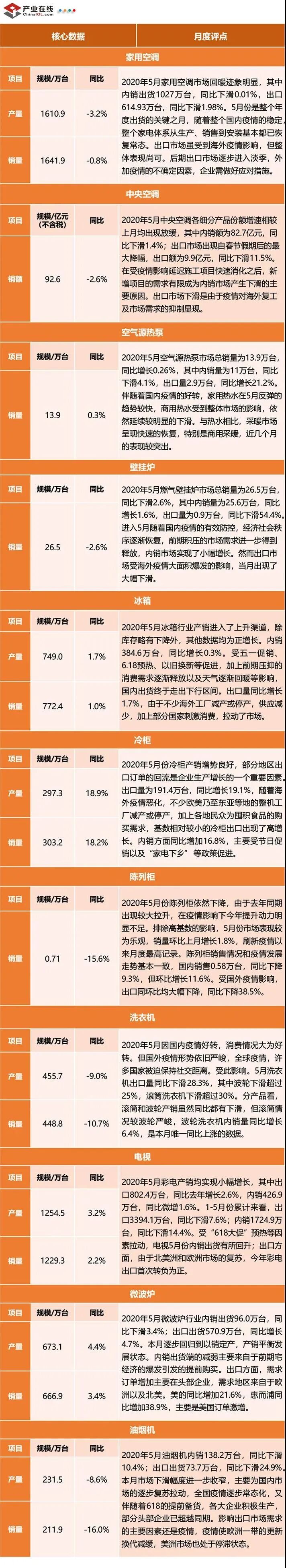 产业在线最新发布数据显示,2020年5月整体产业链市场延续上月回暖态势。整机方面,冰箱、冷柜、热泵、微波炉等行业同比实现了不同程度的增长,上游阀件也实现了全品类增长。从内外销来看,内销市场普遍企稳,出口市场走势各异。