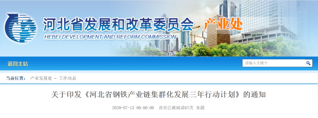 《计划》指出,2020年石钢、河钢乐钢、太行3个退城搬迁项目建成投产,2021年河钢宣钢产能全部退出,2022年城市钢厂搬迁项目基本建成。要有序推进钢铁产能向临港沿铁聚集,重点建设曹妃甸、京唐港(乐亭)、丰南沿海工业区、渤海新区四大临港精品钢铁基地。 《计划》具体内容整理如下: 1.贯彻落实《河北省钢铁行业去产能工作方案(2018—2020年)》,综合运用市场机制、经济手段、法治办法,关小促大、保优压劣,2020年压减退出粗钢产能1400万吨,到年底将河北省钢铁产能控制在2亿吨以内,确保“十三五”去产能工作圆满收官。 2.持续巩固去产能成果,严格落实“四个决不允许”要求,发挥河北省、市、县、乡四级联防联控机制,强化督查巡查、远程监控,坚决查处各种违法违规问题,严禁违规新增产能,严防已压产能和“地条钢”死灰复燃。 6.加快推进主体装备大型化改造。鼓励企业加大资金投入,加快实施装备升级改造项目,提高自动化、智能化水平,实现产品提质降耗。2022年底前力争全部完成1000立方米以下高炉(铸造用生铁和特钢企业除外)、100吨以下转炉升级改造,河北省钢铁行业主体装备达到国内领先水平。 7.着力促进产品结构高端化升级。支持企业开展产学研合作,加快超轻金属材料、3D打印金属材料、航空航天领域用合金材料等新材料的研发和产业化,培育一批“人无我有”的高科技钢铁产品;鼓励企业优化工艺流程,提升经营管理水平,壮大一批“人有我优”的高附加值合金钢和优质钢产品,巩固一批“质优价廉”的量大面广普钢产品市场优势,打造“金字塔”型产品结构。 8.稳步推行组织机构集团化发展。加快推进国有企业混合所有制改革,重点推进民营钢铁企业跨区域兼并重组,着力组建1-2家世界级大型集团、3-5家较具国内影响力大型集团为支撑、8-10家新优专特型企业集团,“2310”梯次发展格局得到进一步提升。探索开展不同生产工序间的多模式整合重组,在研发设计、铁前工序、公辅设施等方面加强不同企业、相关行业间资源共享和技术合作。 9.有序实施空间布局合理化调整。加快河钢集团乐亭基地、邢台钢铁等退城搬迁转型项目建设。发挥水曹、迁曹和邯黄铁路运力资源优势,推进沿线企业组团发展,重点建设迁安、武安两大产业集群。有序推进钢铁产能向临港沿铁聚集,重点建设曹妃甸、京唐港(乐亭)、丰南沿海工业区、渤海新区四大临港精品钢铁基地。充分发挥承德地区钒钛资源优势,打造国际一流的钒钛新材料产业基地。稳步推动河钢宣钢产能关停退出。 10.不断提升生产过程绿色化水平。提高炼铁系统工艺水平,进一步优化炉料结构,增加球团矿比例,提高入炉矿品;推广高炉综合长寿、热风炉高温送风、非高炉炼铁等先进冶炼工艺和技术,降低燃料消耗和原辅料消耗。推进电弧炉炼钢短流程工艺发展,从源头减少进入生产流程的资源,减少废弃物产生。加强钢铁生产节能减排,推进高炉余压回收利用、烧结烟气循环、钢渣综合回收利用、水资源循环利用等生产节能改造,减少污染物排放。加强无组织排放治理,推进“公转铁”“公转水”项目建设。 11.加快推动生产经营数字化转型。全面推进互联网、大数据、人工智能和钢铁产业深度融合,加快智能制造单元、智能生产线、数字化车间建设,烧结球团工序采用模糊控制技术、综合控制专家系统,炼铁工序配套高炉专家系统和数据采集及模型开发技术,炼钢工序应用一键式自动炼钢模式,轧制、仓储等工序建设无人或少人值守车间。到2022年,培育15个以上数字化车间,打造3家以上智能制造标杆项目。 12.打造优质板材生产集群。加强与汽车、家电、造船等下游企业的近终端合作,加快汽车板、家电板、硅钢等高端板材产品的研发和生产,进一步拓展高档汽车面板、新能源汽车用钢市场。鼓励板材生产企业加快实施低水平热轧机改造,推进轧钢生产线自动化、智能化升级,积极建设冷轧、镀锌等深加工生产线,打造冷轧薄板、镀层板、涂层板等高附加值板材生产集群,力争到2022年底热轧一次板材深加工比例达到30%以上。 13.推进型钢生产基地建设。大力发展钢结构建筑,鼓励企业建设钢结构示范产业基地,建立钢结构组配件加工配送中心。支持企业积极研发生产强度高、耐腐蚀、耐低温等高端产品,开展与钢结构建筑构件需求相适应的定制化服务,满足现代钢结构建筑不断提高的安全、长寿、个性化要求。引导企业加强协调合作,统筹项目规划与产品分工,进一步完善品种规格,实现差异化互补发展,共同打造H型钢、角钢、槽钢、钢板桩等品种多样、规格齐全的型钢生产基地。 14.巩固线棒材市场优势。鼓励线棒材生产企业开展500兆帕以上热轧带肋钢筋的研发生产,引领产品升级。推动钢筋、线材产品延深加工,建立完善加工配送中心,为建筑商提供支架、焊网等终端产品加工配送服务。支持特钢企业结合工艺技术装备改造升级,开发轴承钢、齿轮钢等优特钢产品。 15.延伸钢材深加工产业链条。鼓励钢铁冶炼企业建设钢材加工配送中心,发展剪切、配送等增值服务。发挥钢铁产品提质升级带动作用,提升钢铁制品产业发展质量,促进标准件、丝网、汽车部品部件、管道管件等一批市场竞争力强的钢材加工产业集群提质增效。 16.适度开展相关多元发展。支持钢铁企业发展新一代信