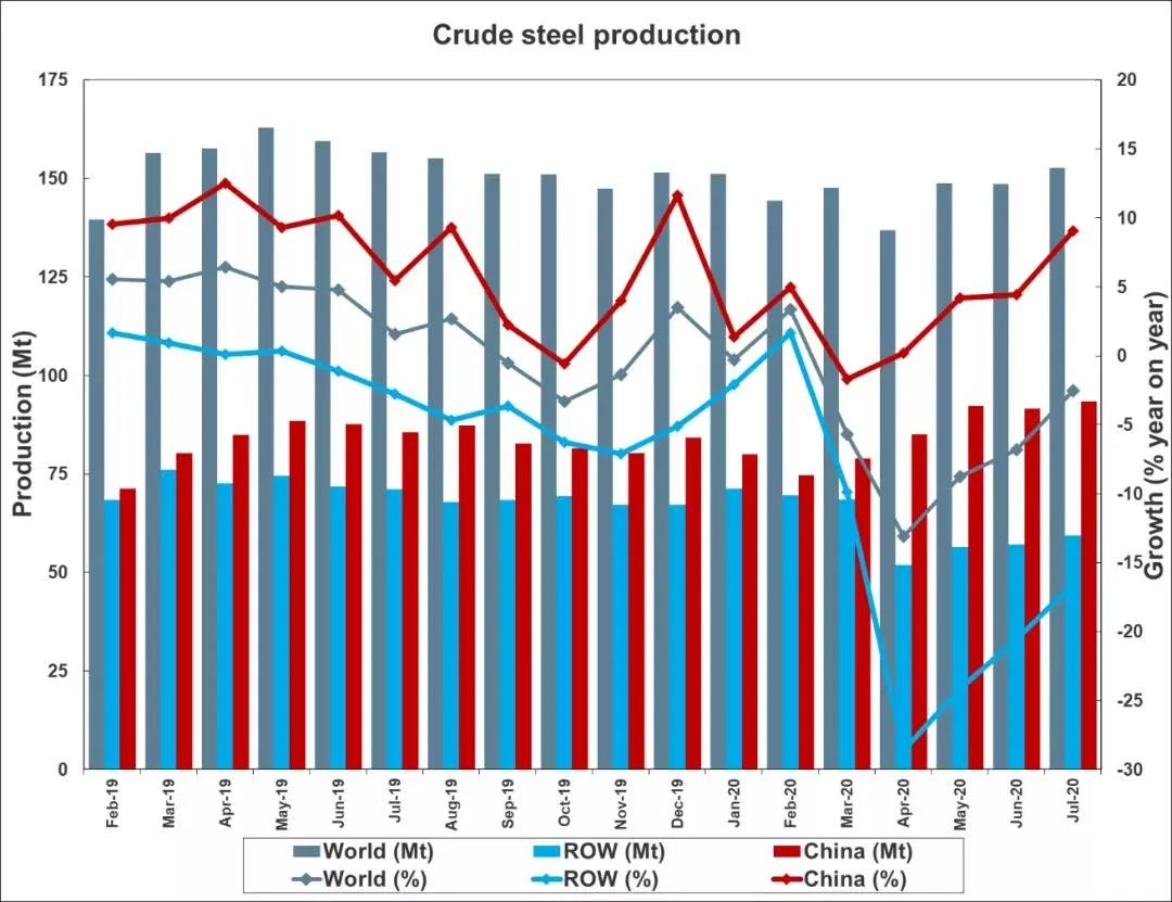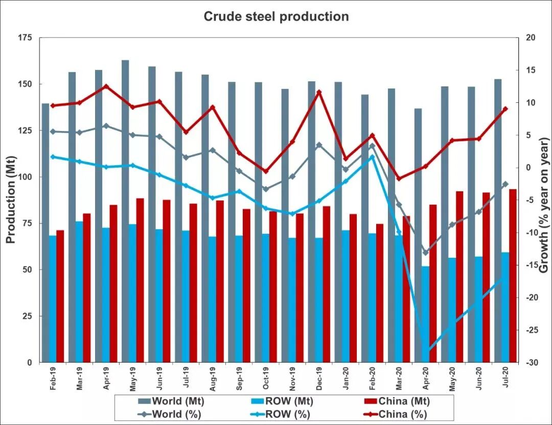 世界钢铁协会(World Steel Association)发布的最新数据显示,2020年7月全球64个纳入世界钢铁协会统计国家的粗钢产量为1.527亿吨,同比下降2.5%。2020年7月,中国粗钢产量为9340万吨,同比提高9.1%;日本粗钢产量为600万吨,同比下降27.9%;韩国粗钢产量为550万吨,同比下降8.3%。2020年7月,德国粗钢产量为240万吨,同比下降24.7%。本月欧盟地区粗钢产量的预估值为980万吨,同比下降24.4%。2020年7月,美国粗钢产量为520万吨,同比下降29.4%。2020年7月,独联体粗钢产量的预估值为810万吨,同比下降5.8%;乌克兰粗钢产量为180万吨,同比提高1.9%。2020年7月,土耳其粗钢产量为310万吨,同比提高7.4%。
